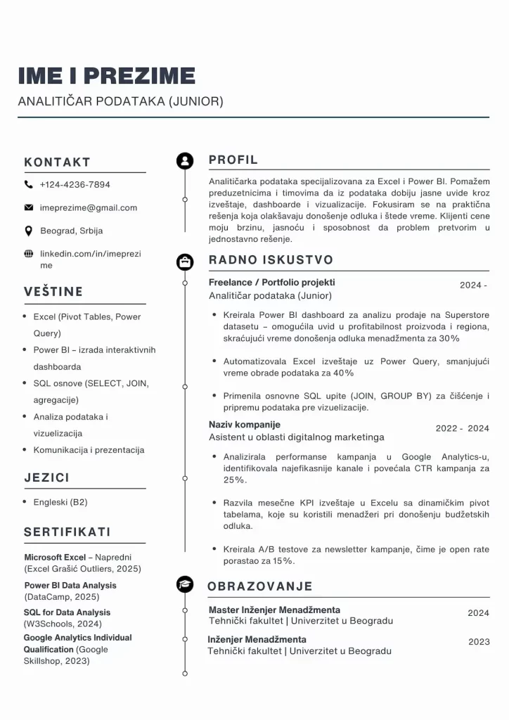 - Formatiraj pravilno: koristi bullet point, jasne standardne nazive (Radno iskustvo/Work Experience, Obrazovanje/Education, Veštine/Skills) i ujednačen format datuma.